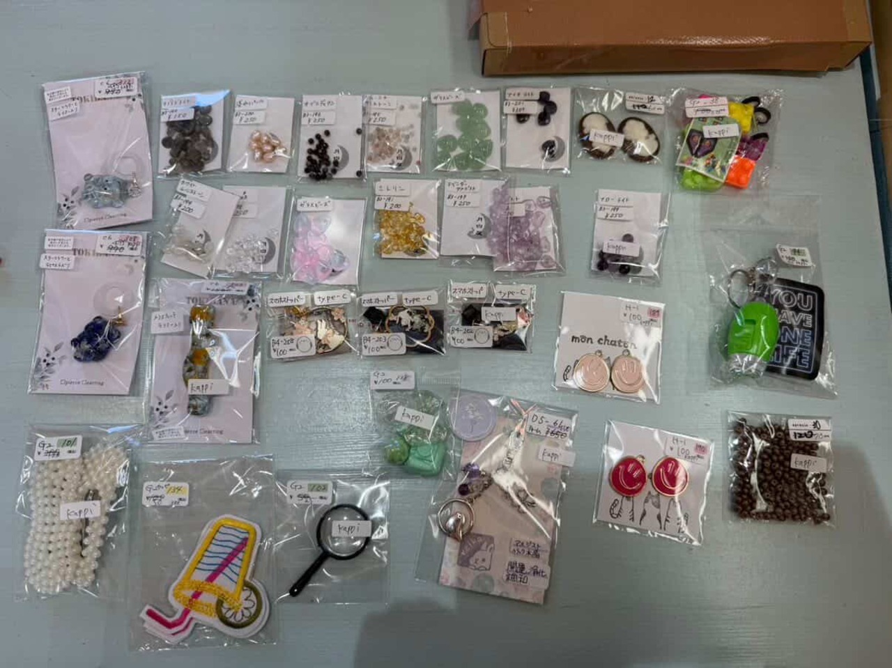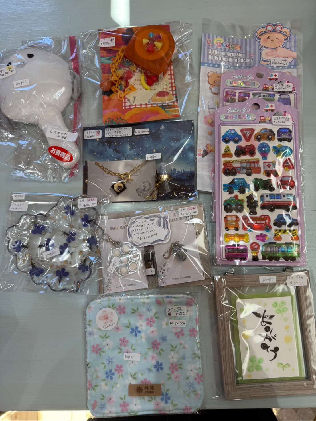 キャンバス、スマホショルダー、ボールペンセット、ヘアゴム、スセミ、手鏡、アクセサリーセット、ハンカチ、シール、天然石資材、ビーズ、クレヨン、キーホルダー、天然石ブレス、天珠